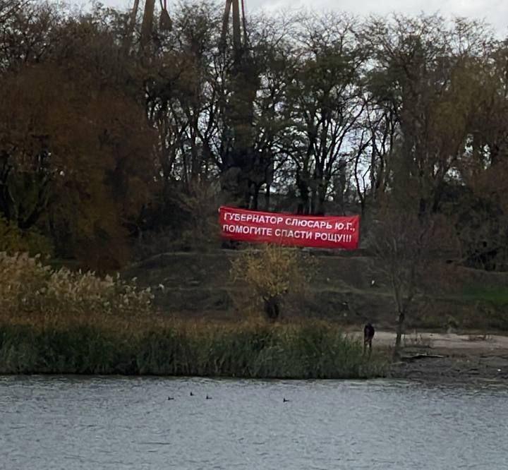 — Губернатор Слюсарь Ю.Г. (верные инициалы Ю.Б. — Прим. ред.), помогите спасти рощу! — написано белыми буквами на красной растяжке.