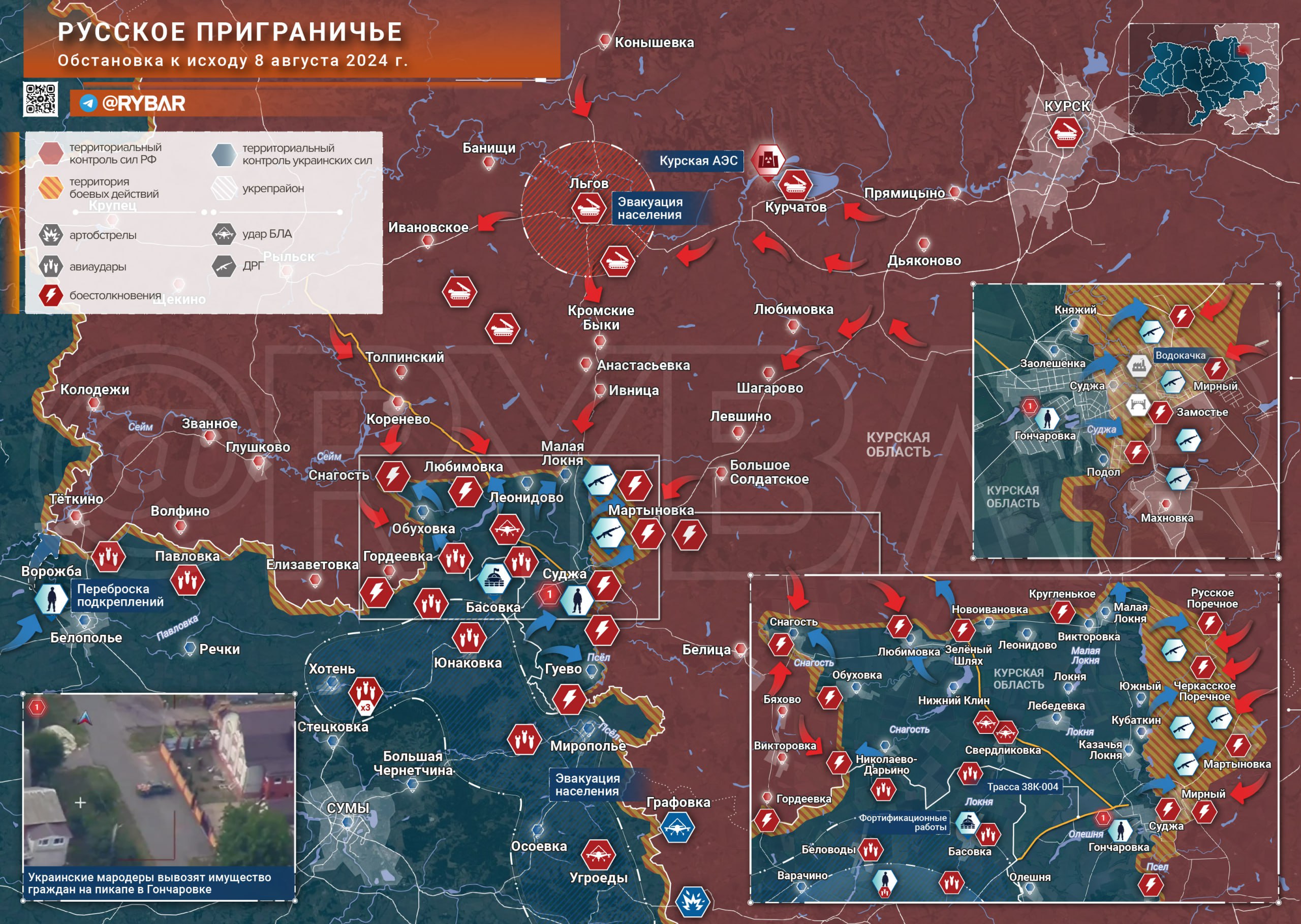 ▪️Утром украинские мобильные ДРГ обошли восточную Суджу и пошли по трассе дальше. Вечером российские силы завязали бой с подразделением ВСУ в Мартыновке, одновременно ведя зачистку лесной зоны и окрёстных деревень.