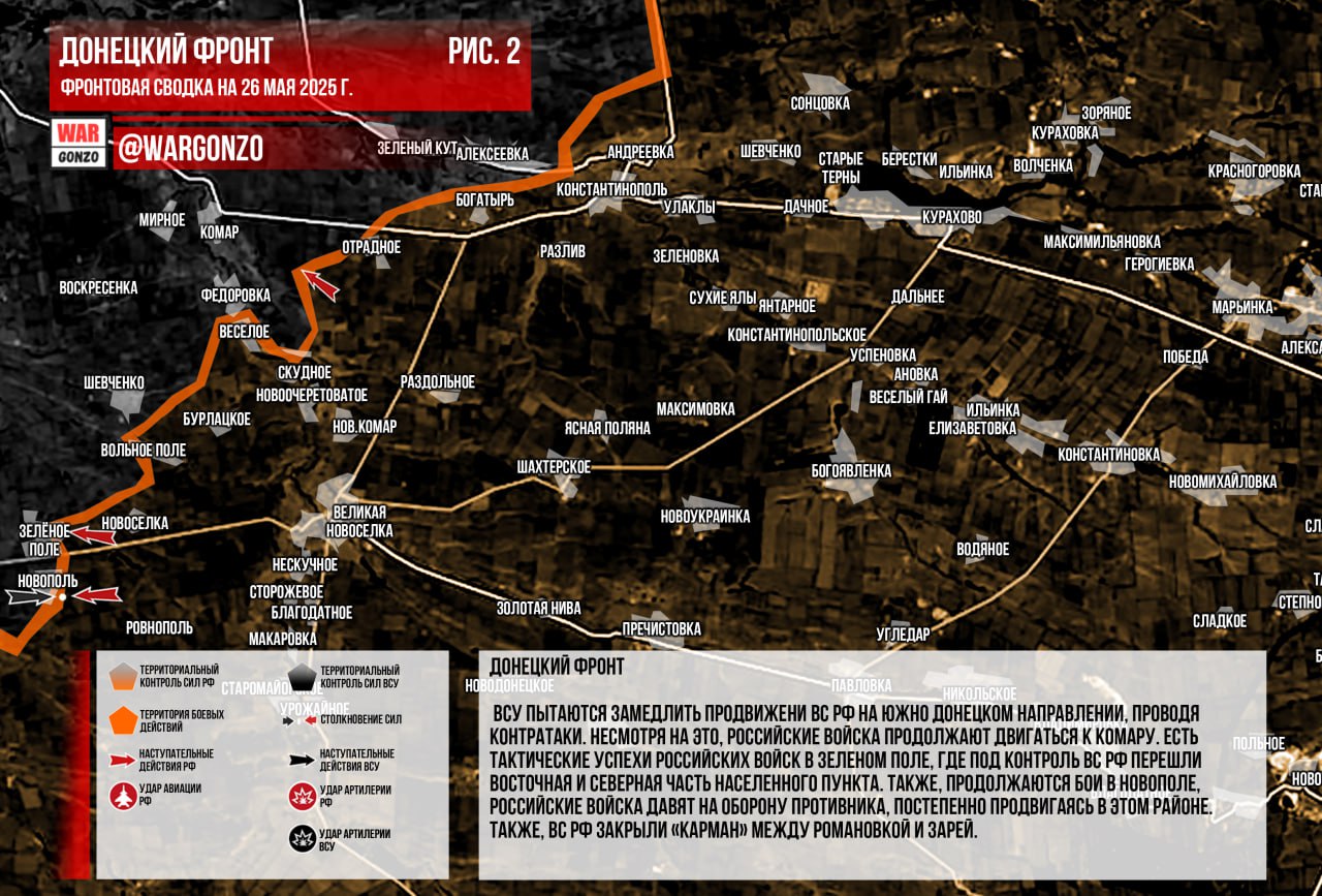 Донецкий фронт. ВСУ пытаются замедлить продвижени ВС РФ на Южнодонецком направлении, проводя контратаки. Несмотря на это, российские войска продолжают двигаться к Комару. Есть тактические успехи российских войск в Зеленом Поле, где под контроль ВС РФ перешли восточная и северная часть населенного пункта. Также, продолжаются бои в Новополе, российские войска давят на оборону противника, постепенно продвигаясь в этом районе. Также, ВС РФ закрыли «карман» между Романовкой и Зарей. (Рис. 2)