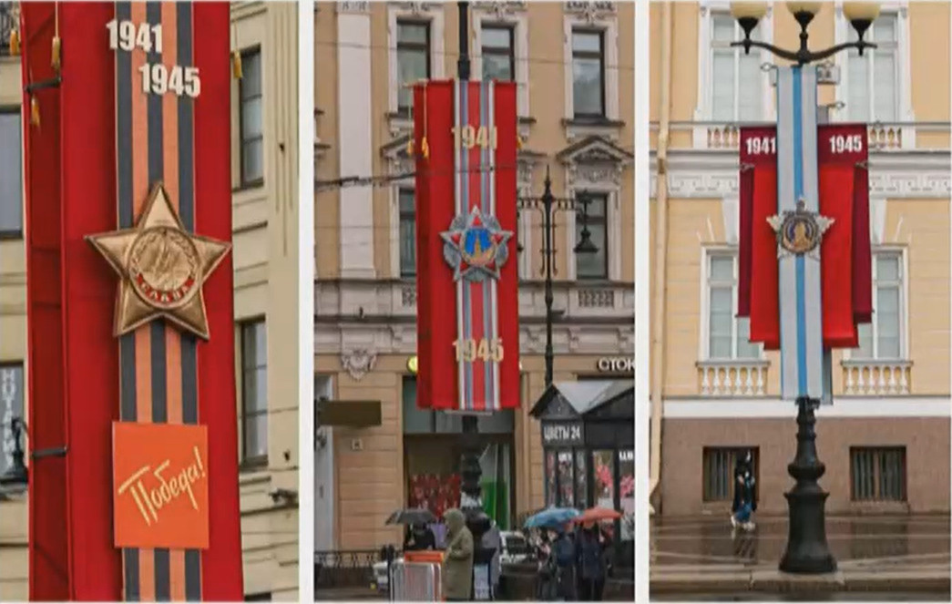 В 2024 году администрация Петербурга использует для оформления города к 9 мая больше 16 тысяч праздничных элементов. Это будут гербы и флаги городов воинской славы, городов-героев, изображения орденов и штандарты фронтов Великой Отечественной войны. Будут использованы также серии плакатов «Народная победа», «Герои Советского Союза» и плакаты с портретами еще живых ветеранов ВОВ. Ими займут больше 500 сторон рекламных конструкций в Петербурге. Будут задействованы и электронные рекламные табло. На некоторых из них запланированы трансляции поздравительных роликов. Традиционно будет украшен к празднику и общественный транспорт.