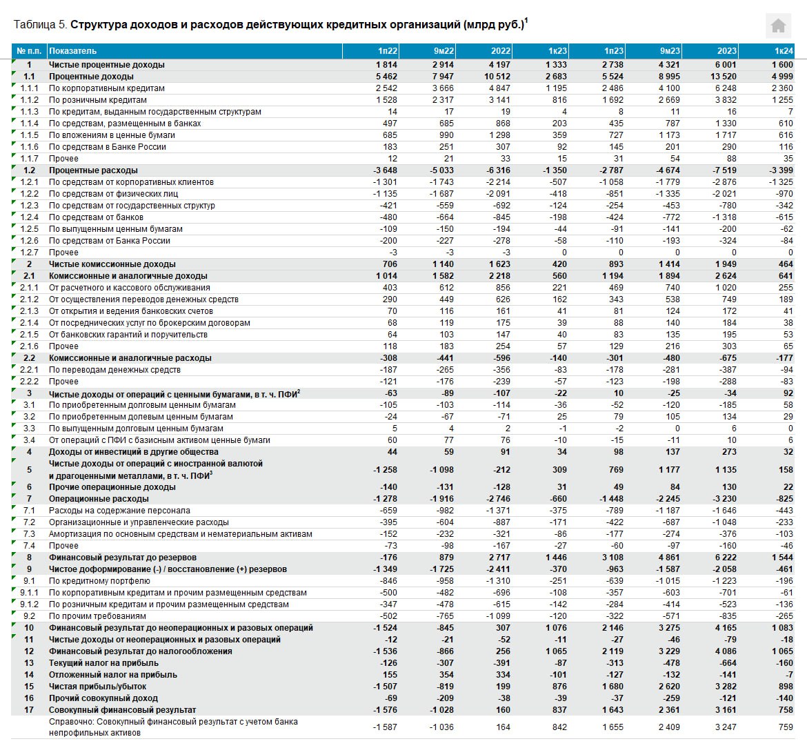 5 трлн рублей составили процентные доходы банков в 1кв24 vs 2.68 трлн в 1кв23, однако доходы от кредитов составили 3.61 трлн руб (2.36 трлн руб корпоративные + 1.26 трлн руб по физлицам) в 1кв24 vs 2 трлн годом ранее (1.12 + 0.81 трлн руб соответственно).
