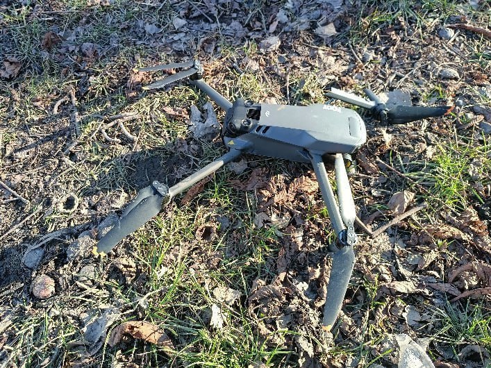 На фото — разведывательный БПЛА противника, посаженный средствами РЭБ в районе одной из тыловых воинских частей.