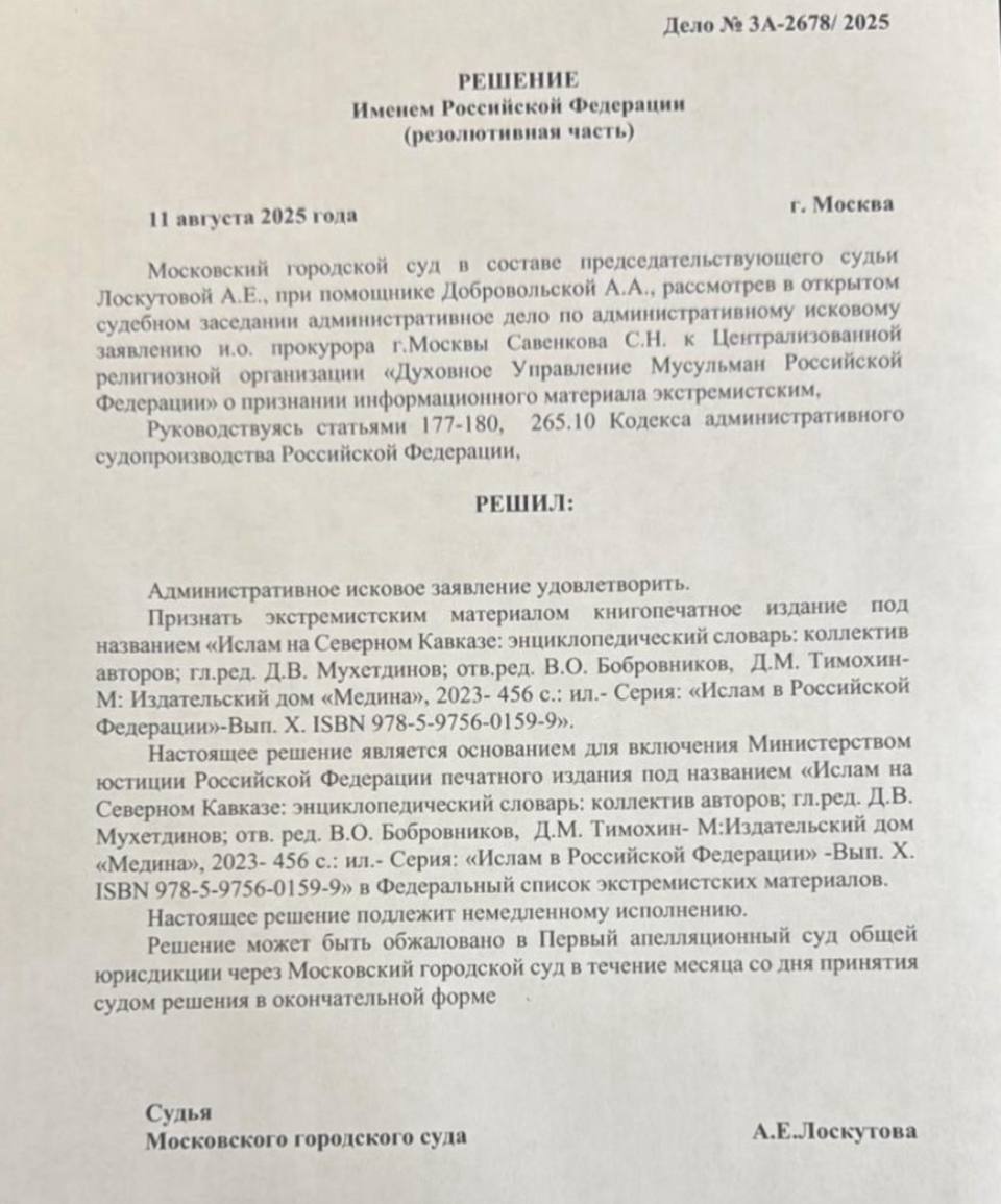 ⚡️Пришла очень важная информация, которую мы ждали. Мосгорсуд признал книгопечатное издание "Ислам на Северном Кавказе: энциклопедический словарь" экстремистским материалом. А поскольку идеологические корни этого "коллективного произведения" (создано группой лиц по предварительному сговору) растут из ДУМ РФ, то возможно обоснованно предложить, что скоро и в эту "кузницу экстремистов" пришлют "доктора". Давно пора. А то с "пациентом" всё хуже и хуже, потерял ориентацию во времени и пространстве.