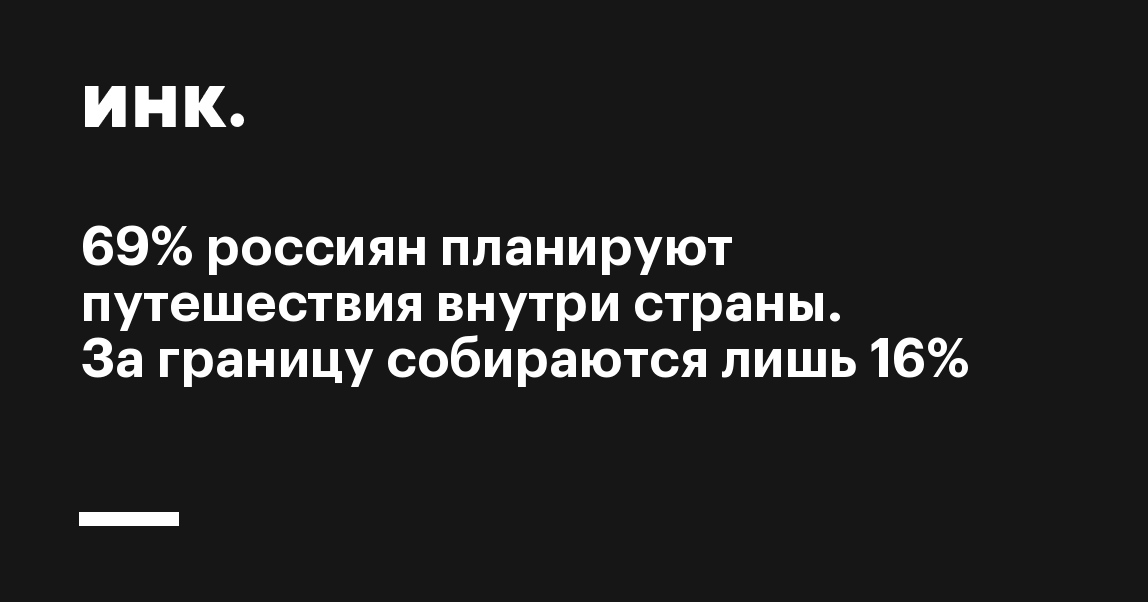 Согласно исследованию сервиса бронирования отелей «Отелло» (разработка 2ГИС), подавляющее большинство россиян (85%) планируют провести летний отпуск в путешествиях. Аналитики опросили 1,6 тыс. россиян и выяснили, что 69% выбирают российские направления, тогда как 16% собираются за границу. Подробности — в распоряжении редакции «Инк.».