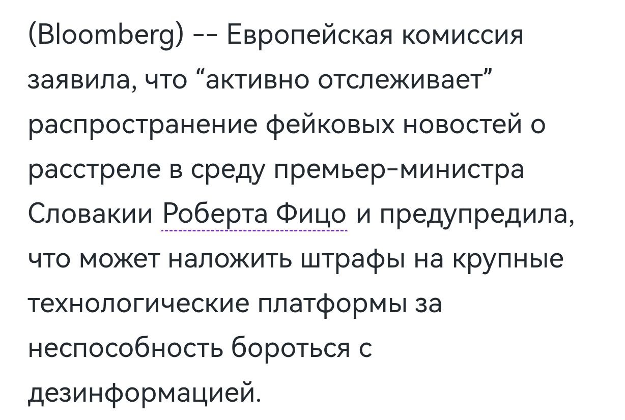 Еврокомиссия предупредила, что "следит за распространением фейков" о стрельбе в премьера Словакии Фицо, и будет накладывать санкции за "неспособность пресекать неверную информацию".