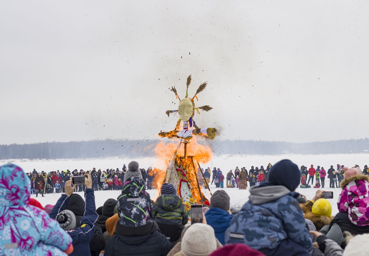 Одна из главных языческих традиций на этом празднике – сжигание чучела Масленицы. По обычаю, в горящий костёр обязательно бросают блины и прочую еду, чтобы год был удачным и принёс в дома сытость и благополучие. Оставшийся пепел разбрасывали по полям, чтобы «накормить» землю-матушку.