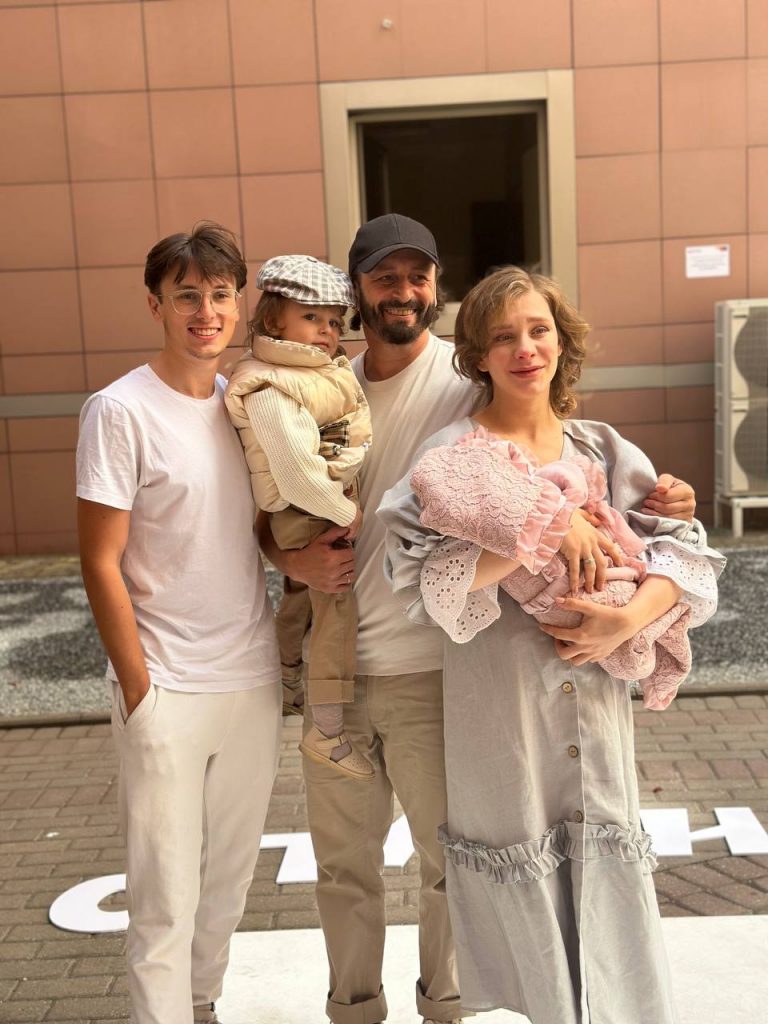 Встречать звезду из больницы пришла вся семья. На одной из фотографий актриса стоит с заплаканными глазами, а рядом с ней муж Илья Авербух, сын Лев и пасынок Мартин.