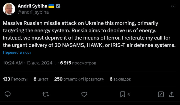 «Массированная российская ракетная атака на Украину сегодня утром направлена в первую очередь на энергетическую систему. Россия стремится лишить нас энергии. Вместо этого мы должны лишить её средств террора. Я повторяю свой призыв к срочной поставке 20 систем ПВО NASAMS, Hawk или IRIS-T», – написал он в соцсети X.