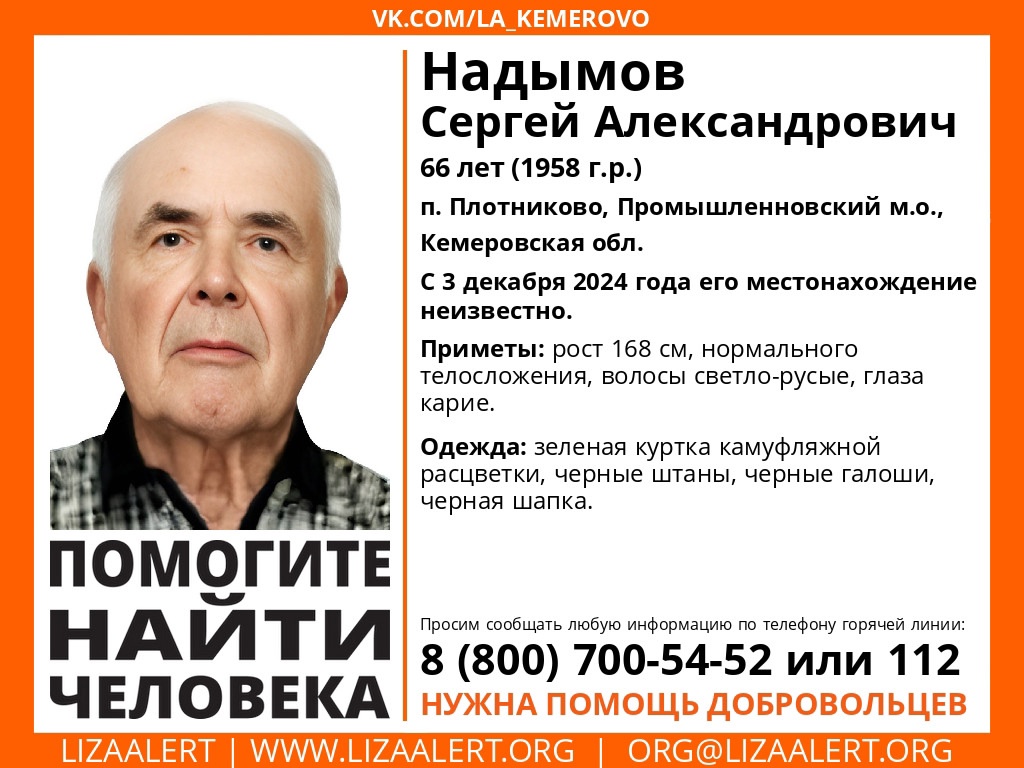 В Кузбассе без вести пропал 66-летний Сергей Надымов. О местонахождении жителя посёлка Плотниково Промышленновского округа ничего не известно с 3 декабря, сообщают волонтёры поисково-спасательного отряда «Лиза Алерт».