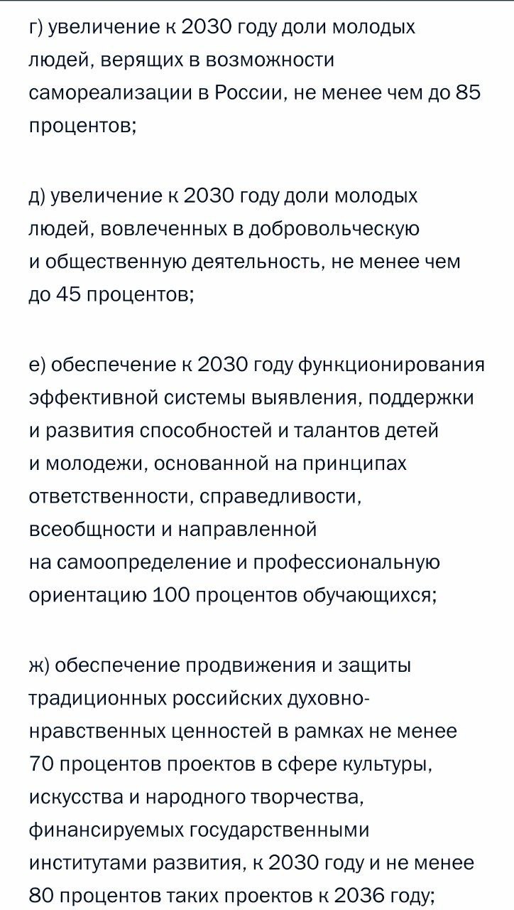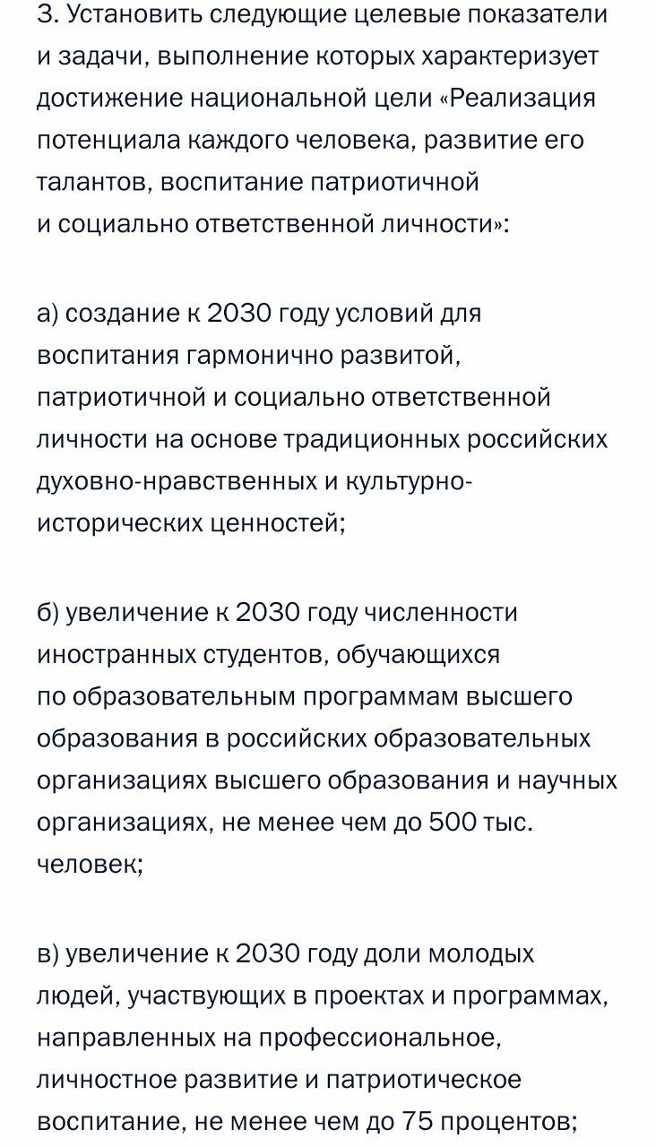 Я тут закреплю целевые показатели национальной цели "Реализация потенциала каждого человека, развитие его талантов, воспитание патриотичной и социально ответственной личности", а то иногда проходит пару месяцев, как может показаться, что там требования по статьям в Scopus, Web of Science и росту в британских рейтингах.