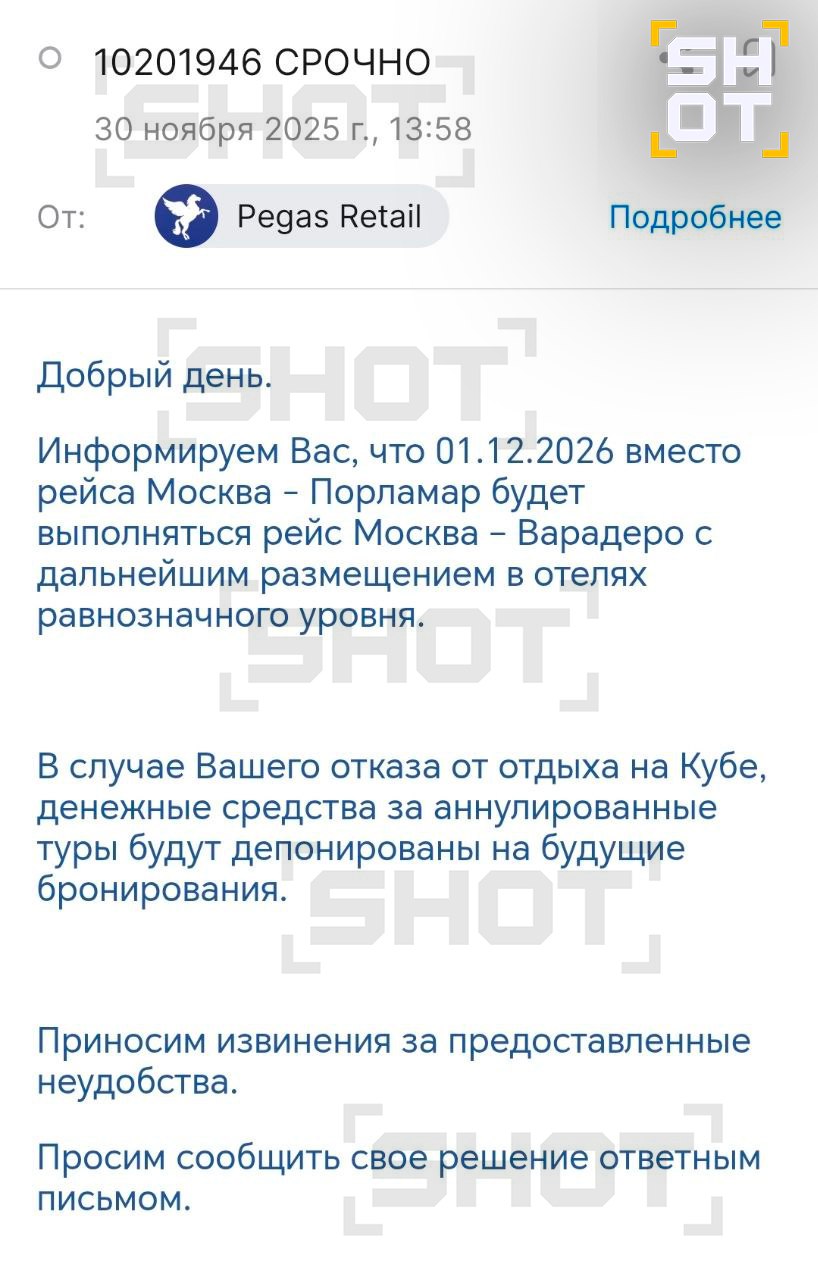 По данным SHOT, вчера вечером туроператор Pegas Touristik начал рассылать клиентам сообщения об отмене купленных ими путёвок в Венесуэлу. Взамен предлагается отдых на кубинском курорте Варадеро. А вот в случае отказа туристам предлагается перенести деньги на «будущие бронирования».