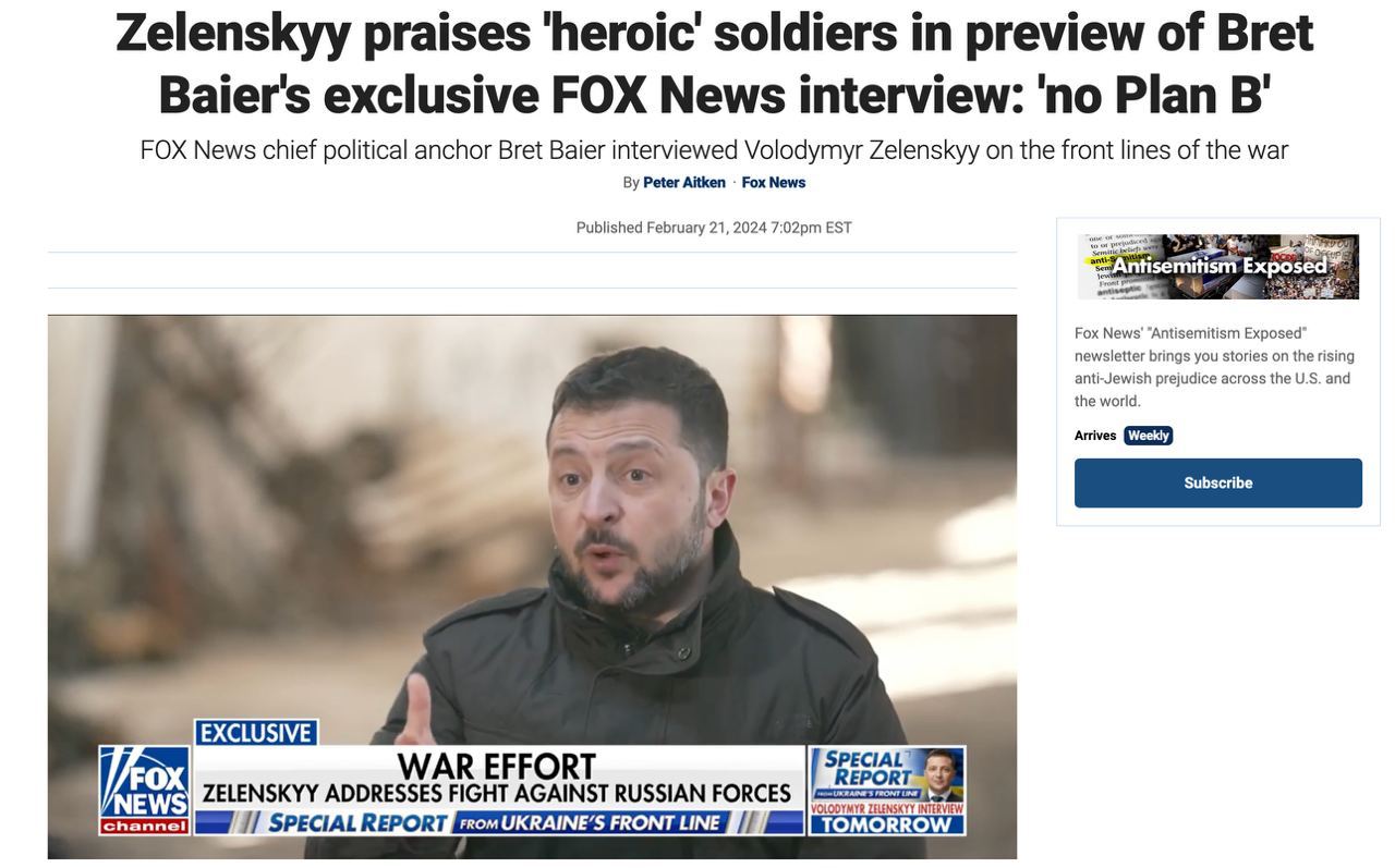 Зеленский в интервью Fox News "отказался обсуждать какой-либо "план Б" для своих войск".