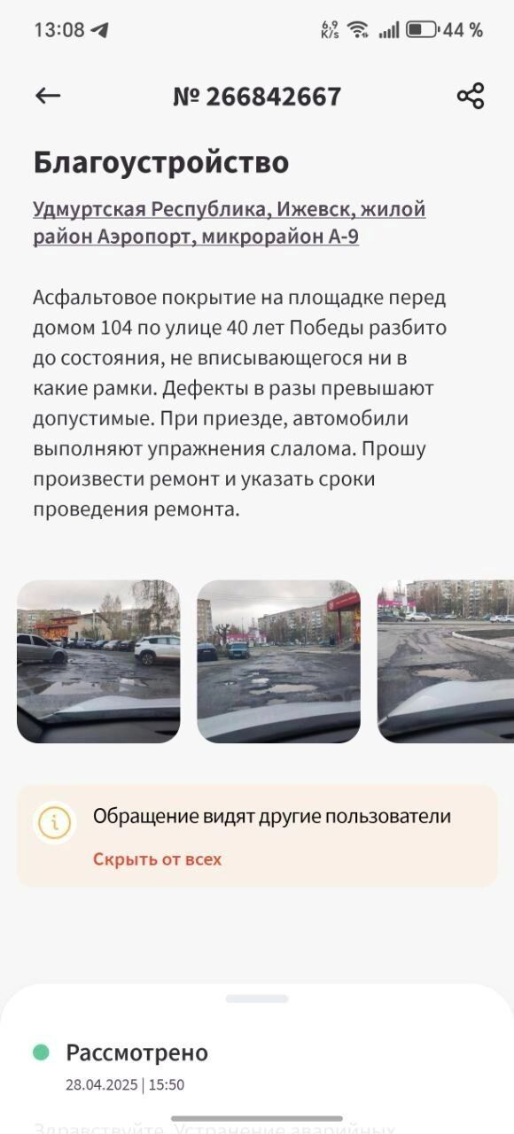 По словам ижевчанина Павла, несколько месяцев назад он направил обращение через ресурс «Решаем вместе» с просьбой отремонтировать площадку в районе домов 104, 98, 96 и торгового павильона по улице 40 лет Победы. Через данную площадку осуществляется въезд во дворы домов № 90… 108, но при этом она совершенно разбита и не ремонтировалась почти в течении сорока лет.