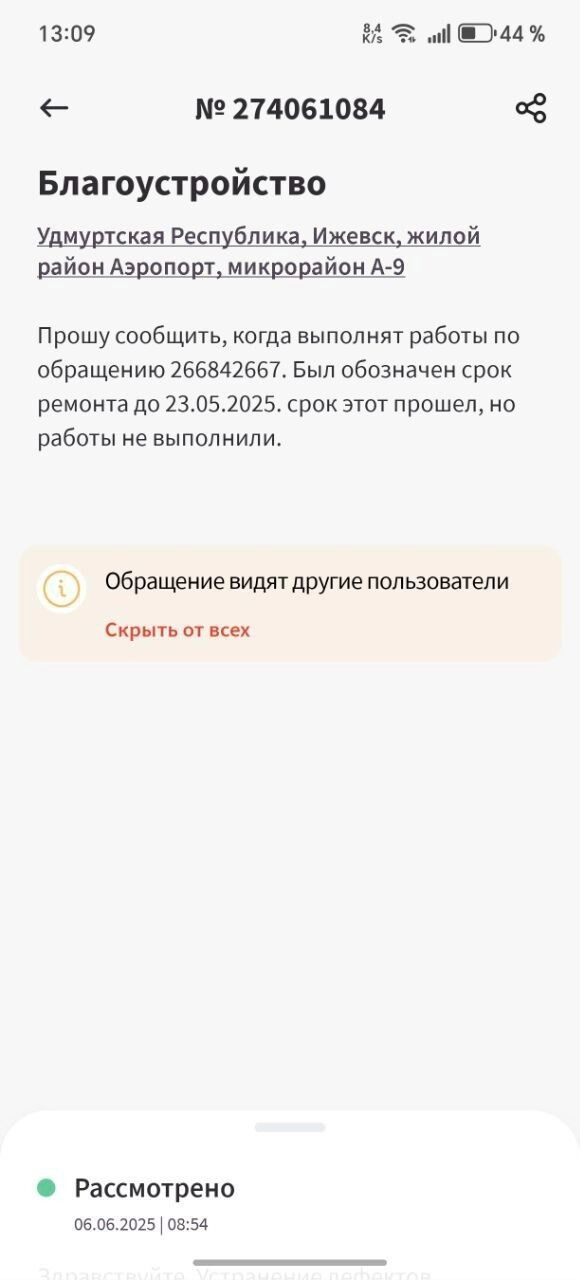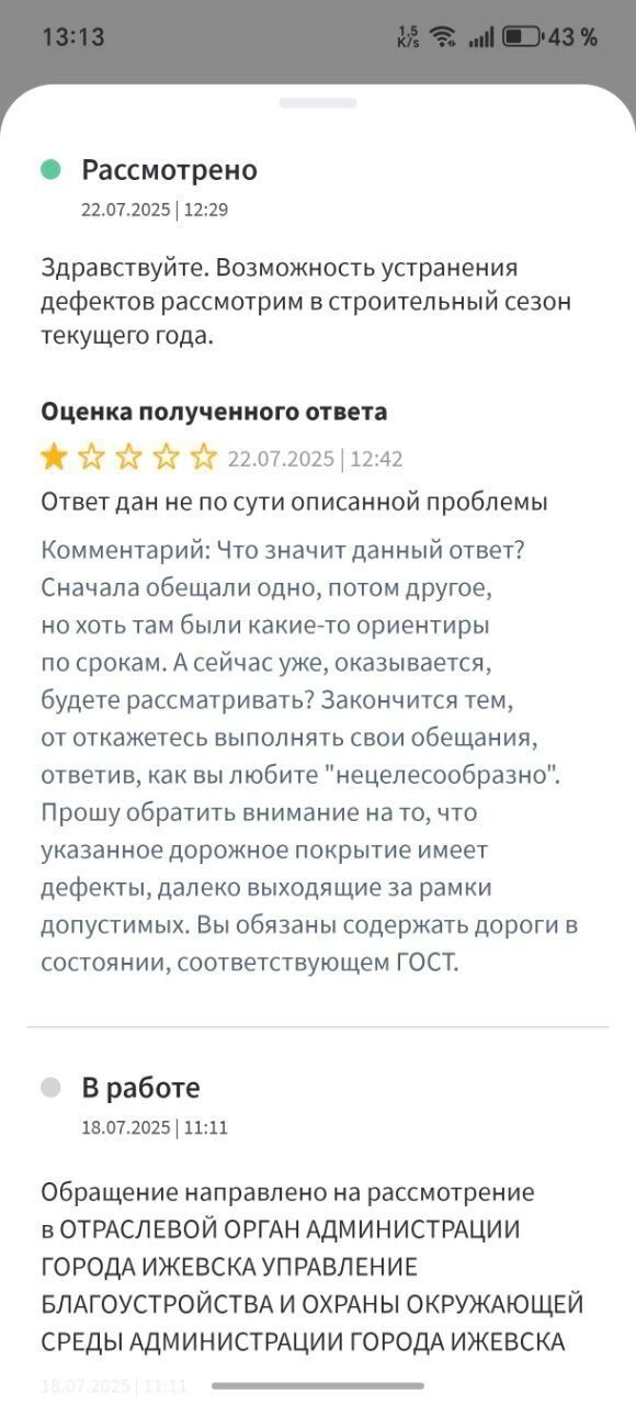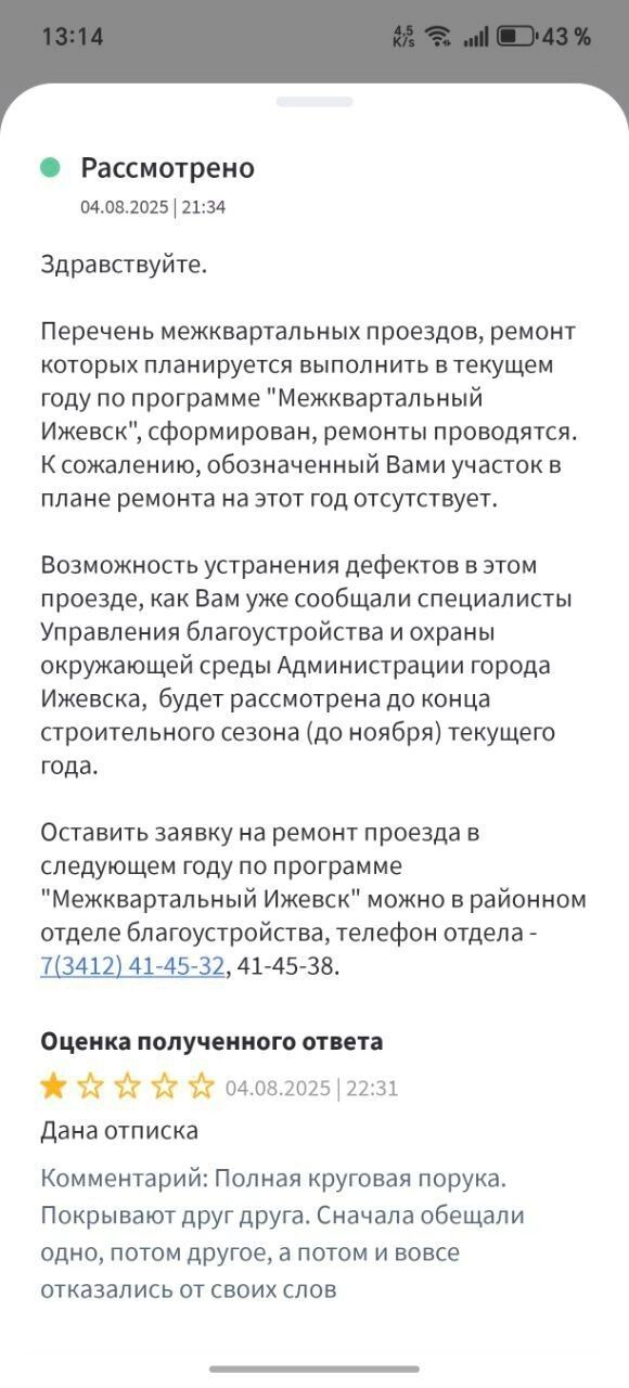 Сначала мужчине ответило управление благоустройства города Ижевска и сообщило что «устранение аварийных дефектов планируется выполнить до 23 мая 2025 года». Но в указанное время дорогу никто так и не отремонтировал.
