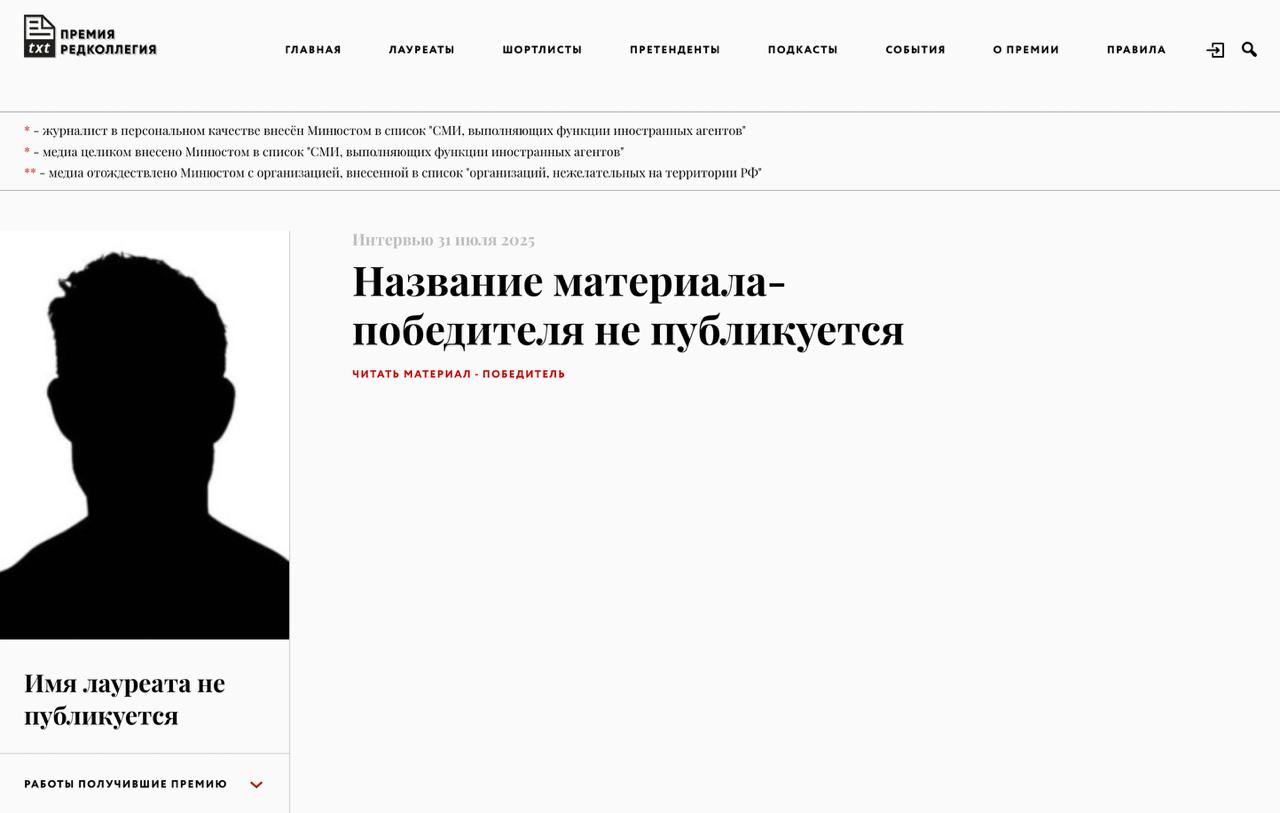 Премия «Редколлегия» решила не раскрывать журналиста, которому досталась награда. Она вручила награду за интервью, вышедшее 31 июля, но не стала сообщать имя автора, потому что он объявлен иноагентом. Также премия не стала упоминать название издания, потому что в России его объявили иноагентом и нежелательной организацией. Название материала, за который наградили журналиста, также не сообщается.