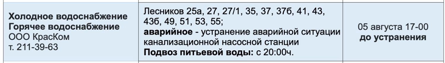 Сегодня, 5 августа, стало известно, что УК решила внепланово отключить холодную воду в домах на улице Лесников — отключение коснется домов №25а, №27, №27/1, №35, №41, №37, №37б, №43б, №49, №51, №53 и №55.
