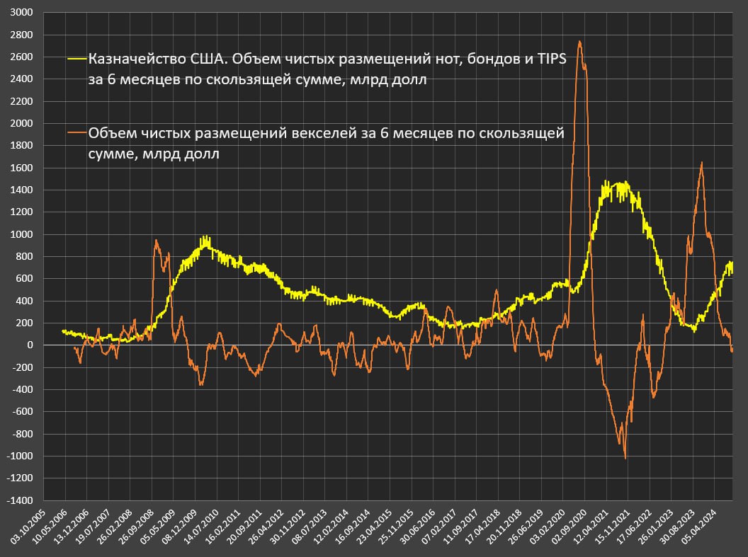 За последний год чистые размещения гособлигаций США составили 2 трлн vs почти 2.75 трлн на пике к марту-маю этого года по скользящей сумме за 12 месяцев, а в ковидный апокалипсис на пике размещали свыше 4.4 трлн за 12м.