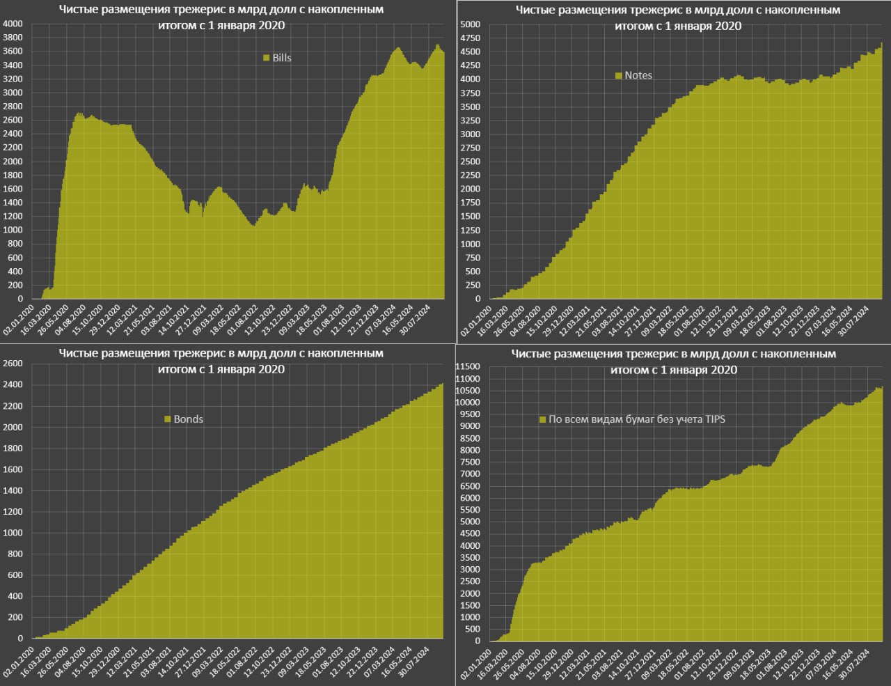 Прочие позиции (TIPS и FRN) собирались разместить на 97 млрд, а получилось 75 млрд. По векселям планировали нулевой баланс (минус 0.3 трлн в 2кв24 и плюс 0.3 трлн в 3кв23), а вышло сокращение на 58 млрд.