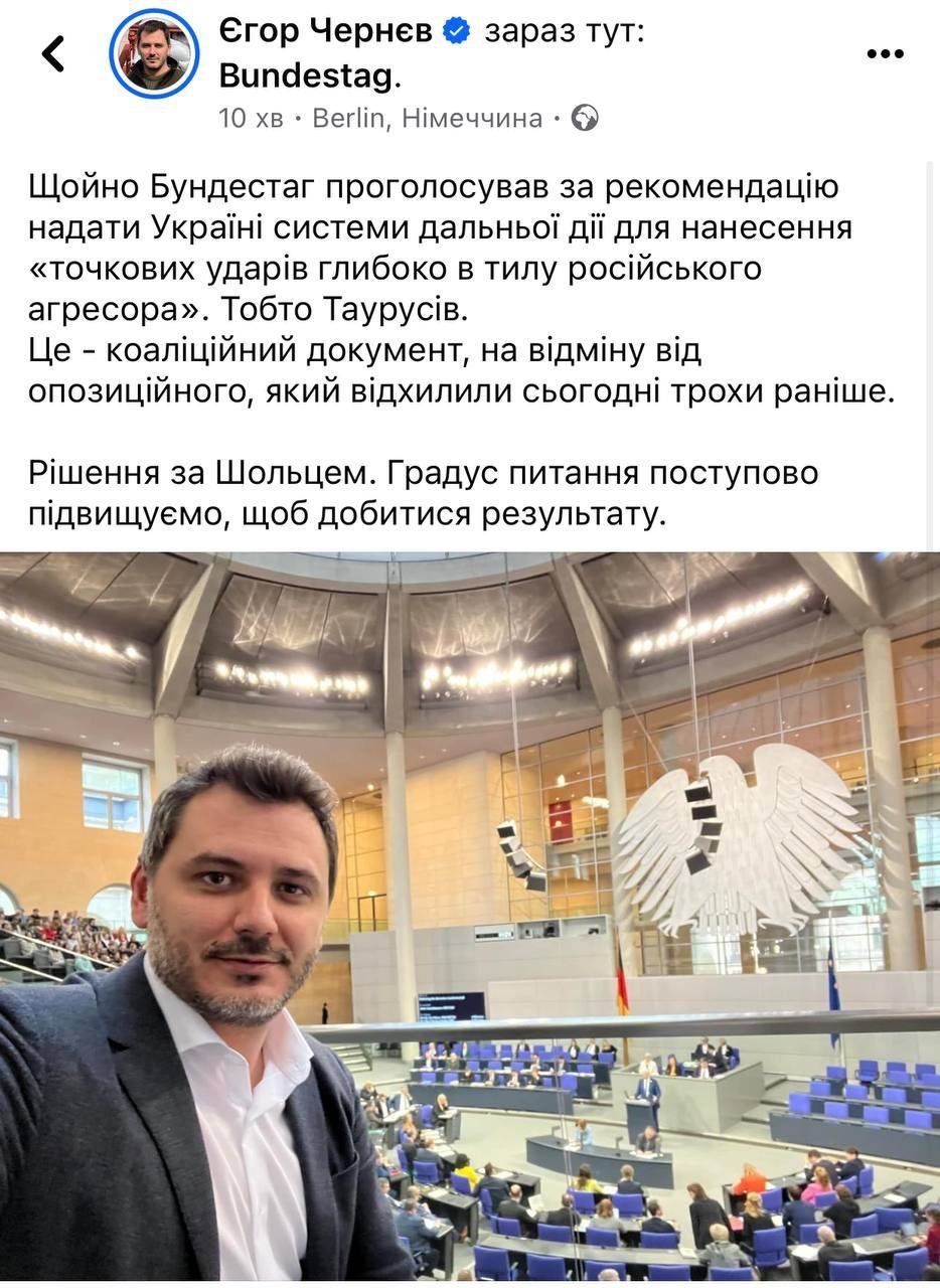 Бундестаг поддержал рекомендацию предоставить Украине дальнобойное оружие. Конкретное оружие не называется. Но, видимо, речь идет о ракетах Taurus.