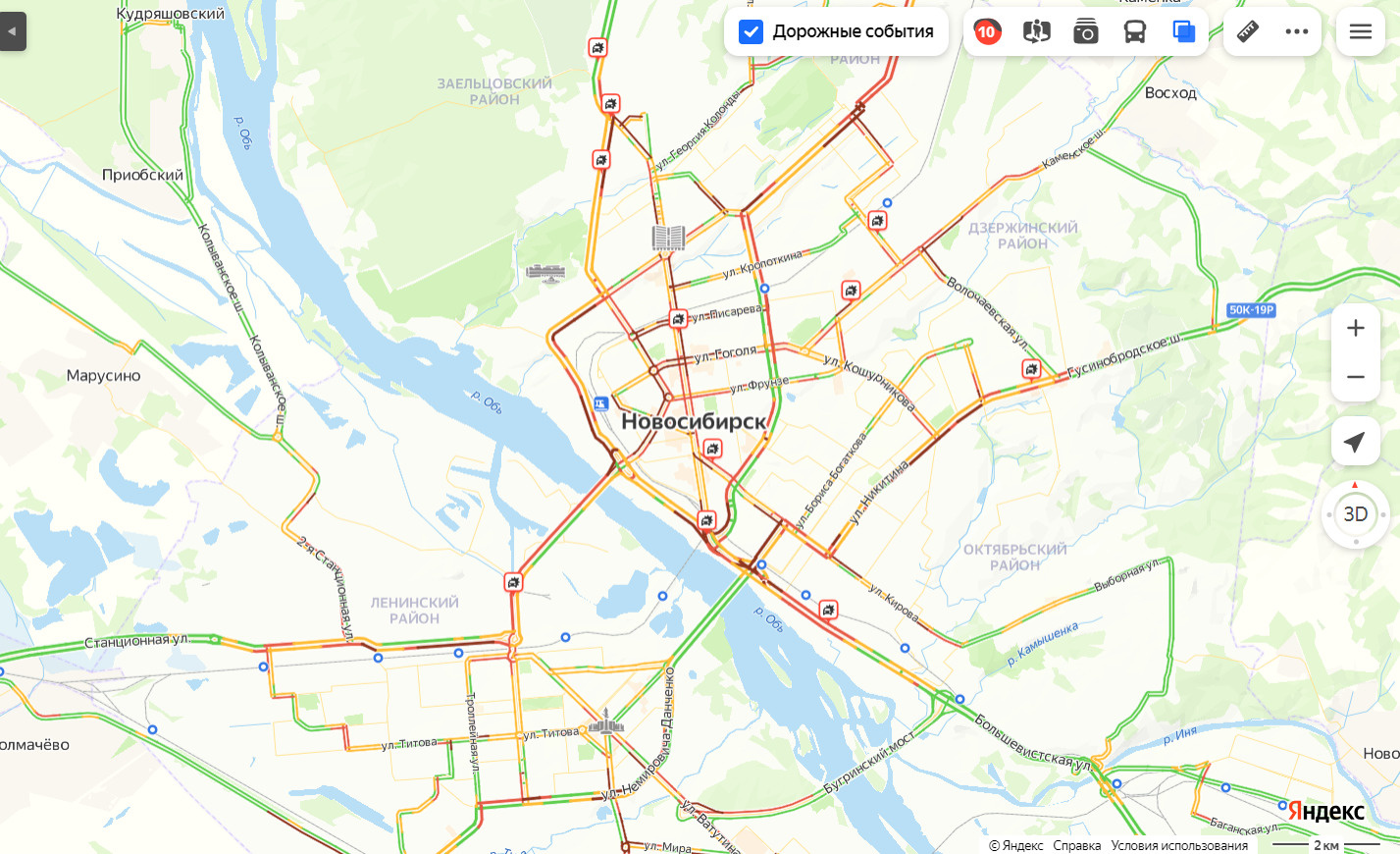 Крупный затор собрался на улице Большевистской, Димитровском мосту, на Красном проспекте и улице Кирова. На левом берегу пробка возникла на улице Петухова, Ватутина и на проезде Энергетиков.