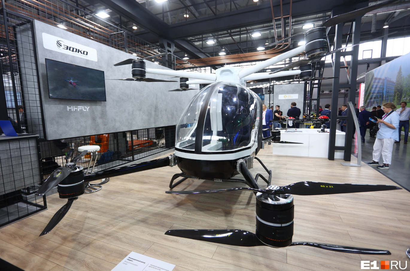 На прошлогоднем «Иннопроме» было представлено много необычных новинок транспортной отрасли. Среди них — беспилотное аэротакси Hi-Fly Cargo. Огромный квадрокоптер способен перевозить двух человек и пролетать до 150 километров. Машина занимает два парковочных места. Разработчик, компания «ЭФКО» отметила, что аэротакси идеально подойдет для тех, кто живет за городом, но кроме личного пользования оно может применяться для перевозки грузов, тушения пожаров и в качестве скорой помощи.