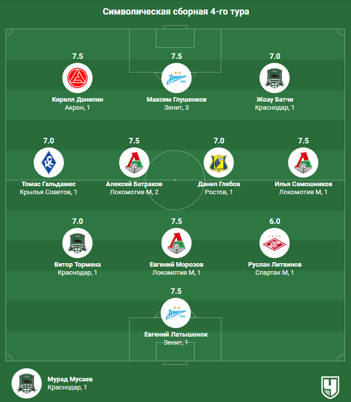 Закончился 4-й тур РПЛ – составляем символическую сборную прошедшего уикенда. В команду героев недели попали игроки из «Зенита», «Спартака», «Краснодара», «Локомотива», «Крыльев Советов», «Ростова» и «Акрона». Футболисты расставлены в рамках условной тактической схемы 3-4-2-1. Главный тренер – из «Краснодара». Заслужил!