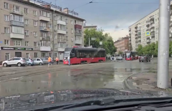На улице Серебрениковской затопило трамвайные пути, и вагоны, не способные пересечь водоем, выстроились в очередь в ожидании ухода воды.