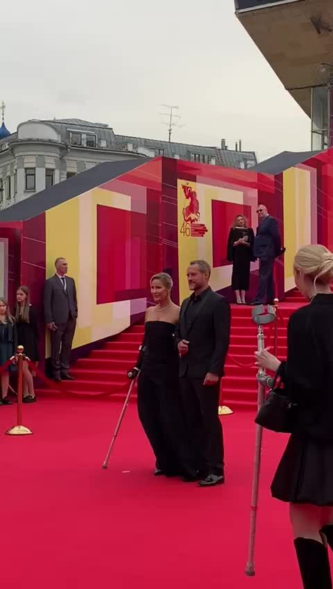 Одной из первых на красную дорожку вышла Елена Летучая в компании супруга. Телеведущая появилась в черном платье с открытыми плечами и… костылем.