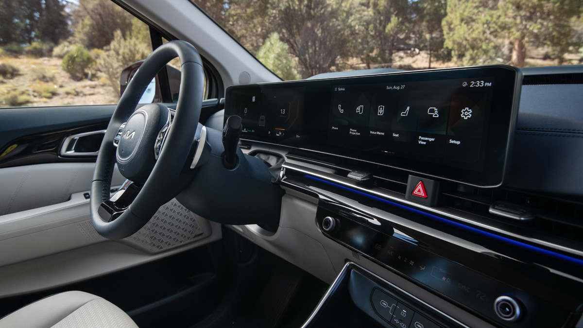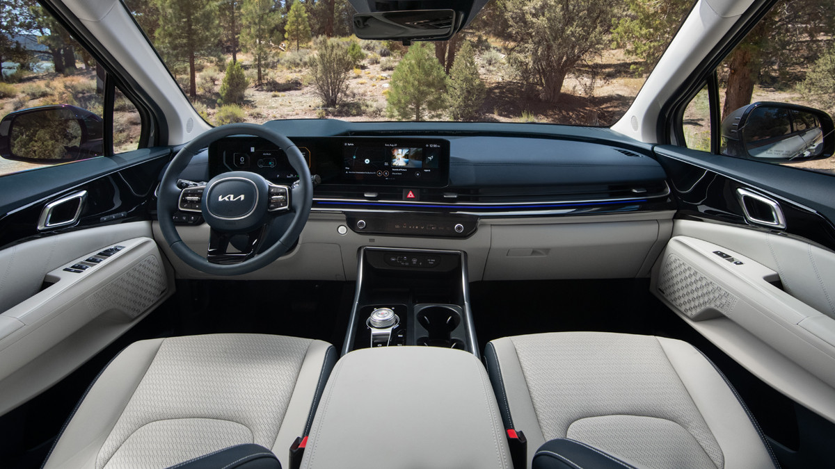 Свою долю обновок получил и салон американской версии Kia Carnival. На передней панели располагается новое горизонтальное табло, которое объединяет в себе пару дисплеев диагональю 12,3 дюйма: один из них исполняет роль виртуального щитка приборов, а второй – тачскрина информационно-развлекательной системы (у дореформенной версии размер экранов такой же, но оформление иное).