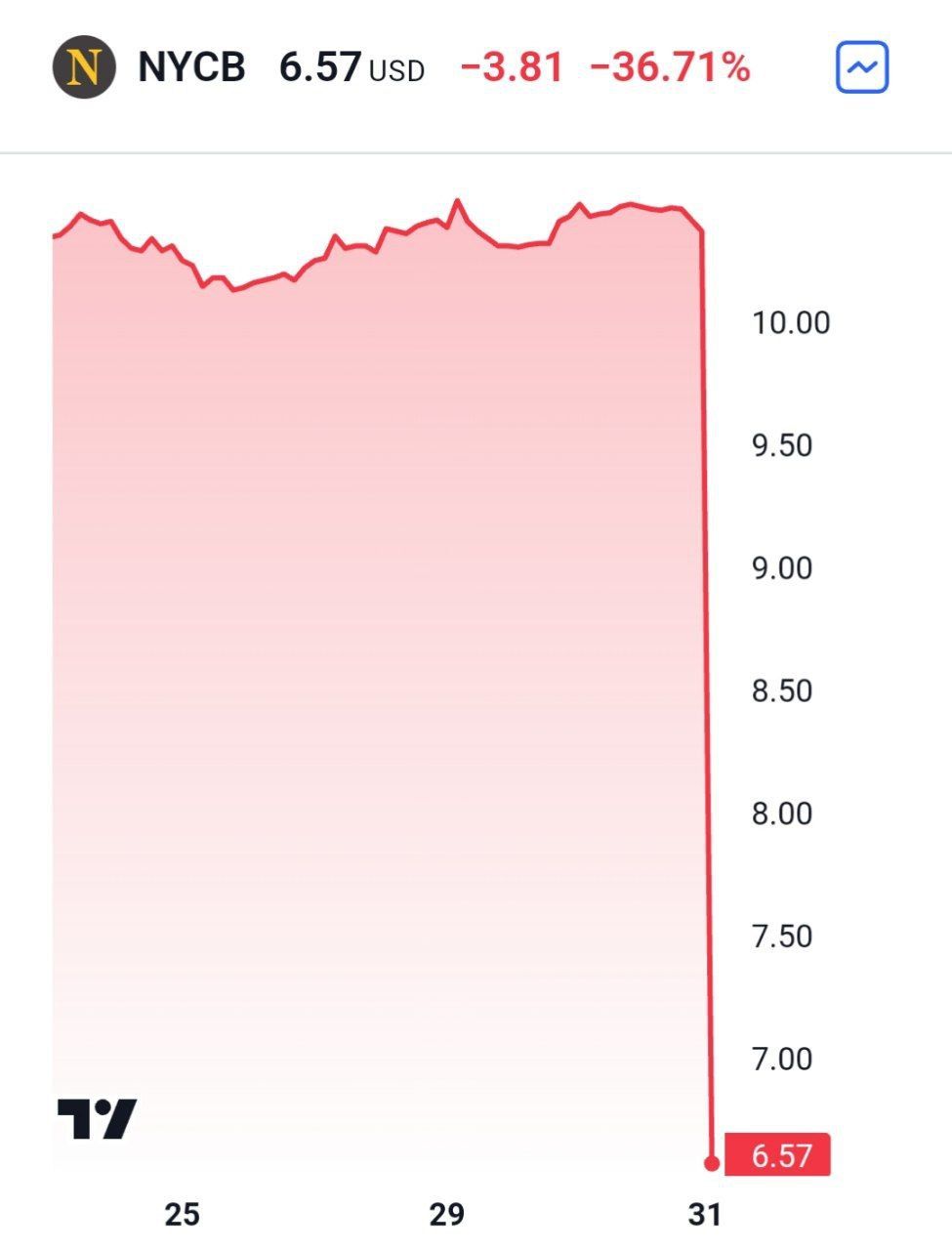 В США возобновились банковские обвалы. Акции банка New York Community Bancorp рухнули на 36%, торговля остановлена.