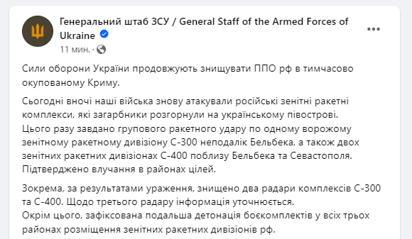 «Уничтожены два радара комплексов С-300 и С-400. По третьему радару информация уточняется».