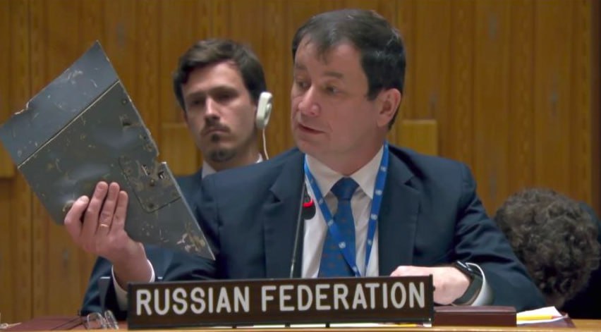 Полянский принес на заседание Совбеза ООН обломки западных ракет, которые Киев использовал для удара по гражданской инфраструктуре. На фото – обломок с места обстрела ракетами Storm Shadow моста в Чонгаре, который важен для поставок продовольствия