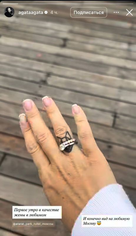 О переменах в личной жизни Агата Муцениеце сообщила в соцсетях. Актриса продемонстрировала новое кольцо и подписала кадр: «Первое утро в качестве жены».
