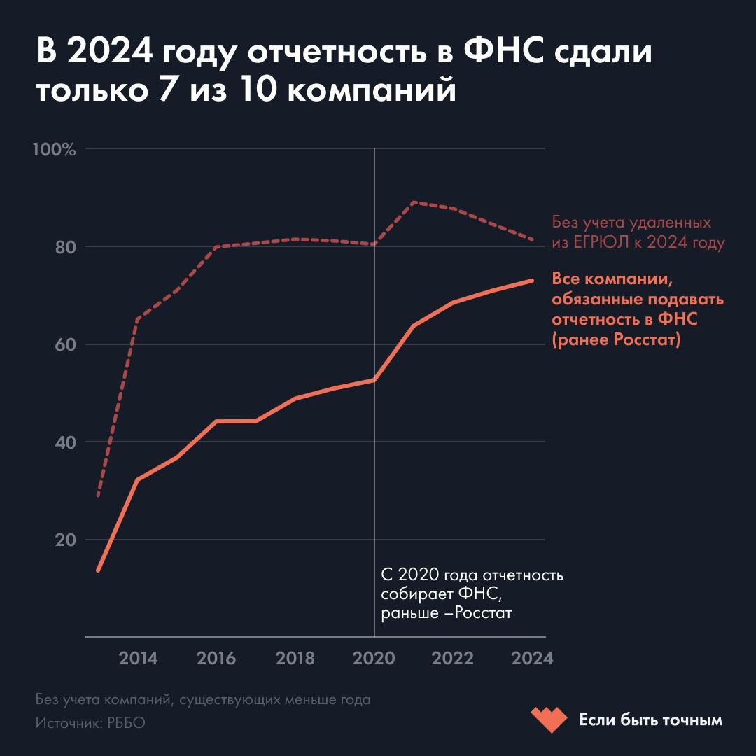 До 2020 года финансовую отчетность фирм собирал Росстат. Тогда о своей деятельности отчитывалась лишь половина компаний из Единого государственного реестра юридических лиц. Положительная динамика последних лет может объясняться чисткой реестра от компаний, которые перестали действовать или сообщили о себе недостоверные сведения: в 2019 году из ЕГРЮЛ было исключено 560 тысяч компаний, то в 2023-м — 173 тысячи. @banksta