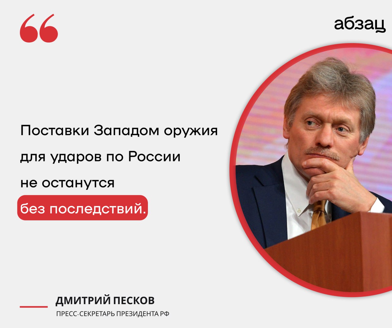 Песков: Поставки Западом оружия для ударов по России не останутся без последствий