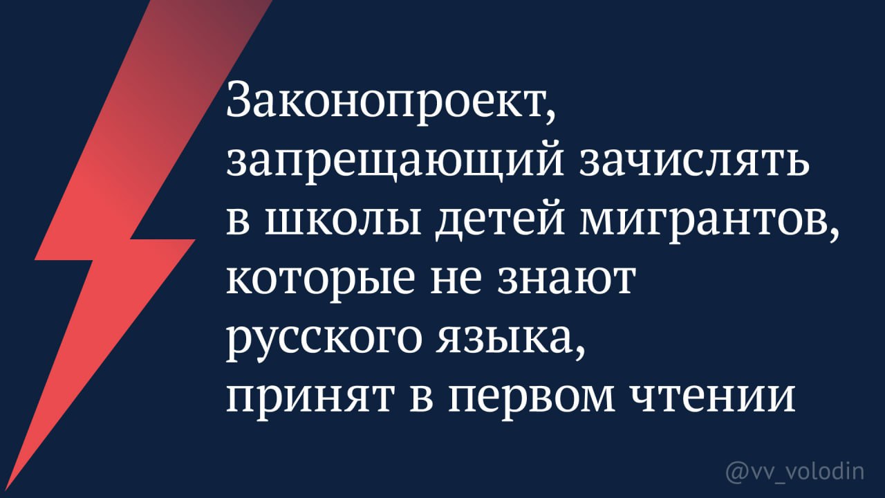 ⚡️ Законопроект, запрещающий зачислять в школы детей мигрантов, которые не знают русского языка, принят в первом чтении.