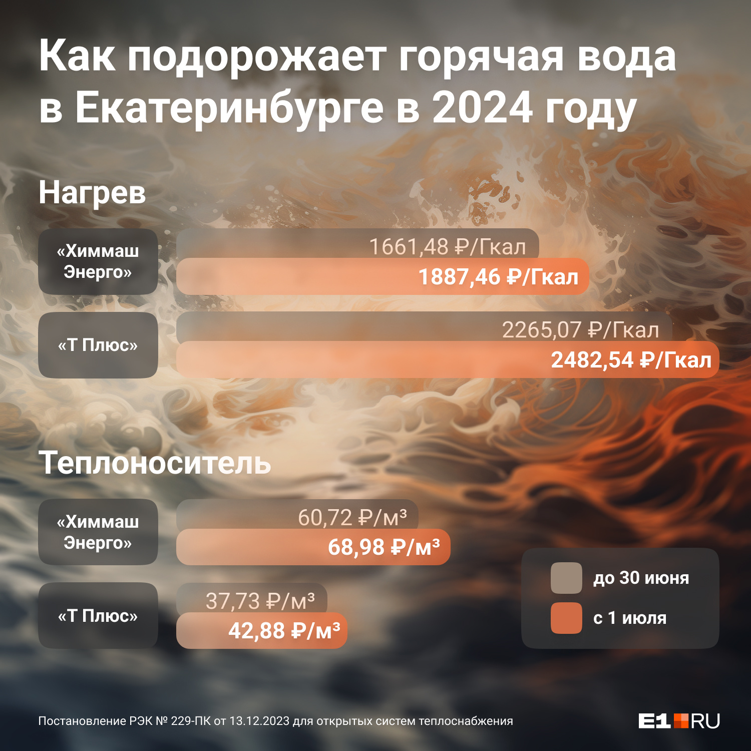 В Екатеринбурге одни из самых крупных поставщиков — компании «Т Плюс» и «Химмаш Энерго». С июля 2024 года «Т Плюс» станет брать на 5,15 рубля больше — 42,88 руб./ м3. Стоимость тепловой энергии изменится на 217,47 рубля — 2482,54 руб./Гкал.