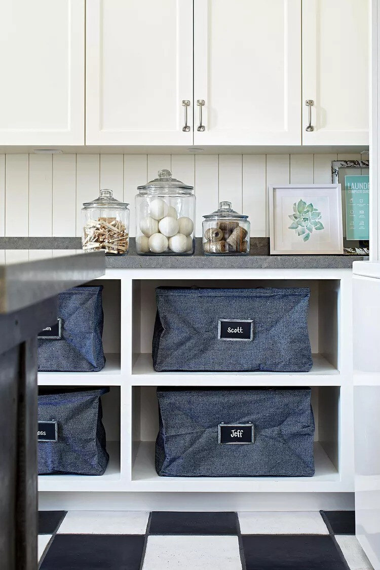 Даже если вы используете для хранения в одной системе разные контейнеры, добавить ощущения порядка помогут одинаковые ярлычки. Они не только помогут лучше ориентироваться в том, что где лежит, но и визуально объединят всю композицию, придав ей единообразия.