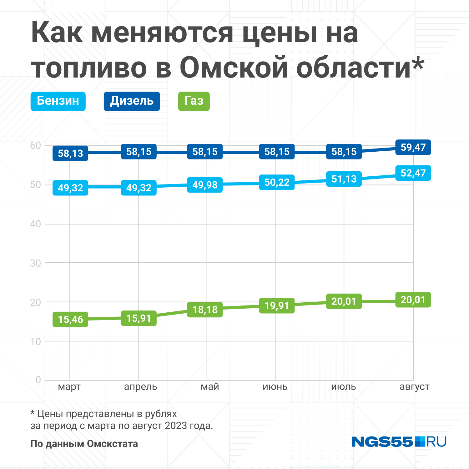 Недавно специалисты Омскстата привели средние августовские цены на топливо в нашем регионе. Мы решили взять цифры за последние шесть месяцев, чтобы показать в инфографике, как меняются цены на топливо. Данных за сентябрь, где уже случилось несколько серьезных скачков, пока нет, однако временной отрезок с марта по август тоже демонстрирует безрадостную картину.