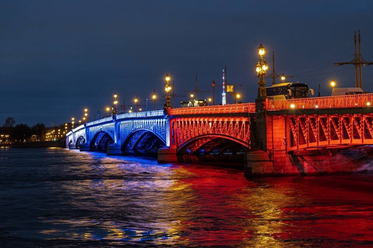 В 20:35 ожидается и включение подсветки Дворцового и Троицкого мостов. Бело-сине-красное оформление можно будет наблюдать до утра.