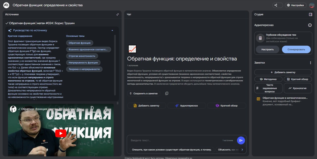NotebookLLM может пересказать любое видео с YouTube, собрать и сжать информацию с cайта или файла. Работает