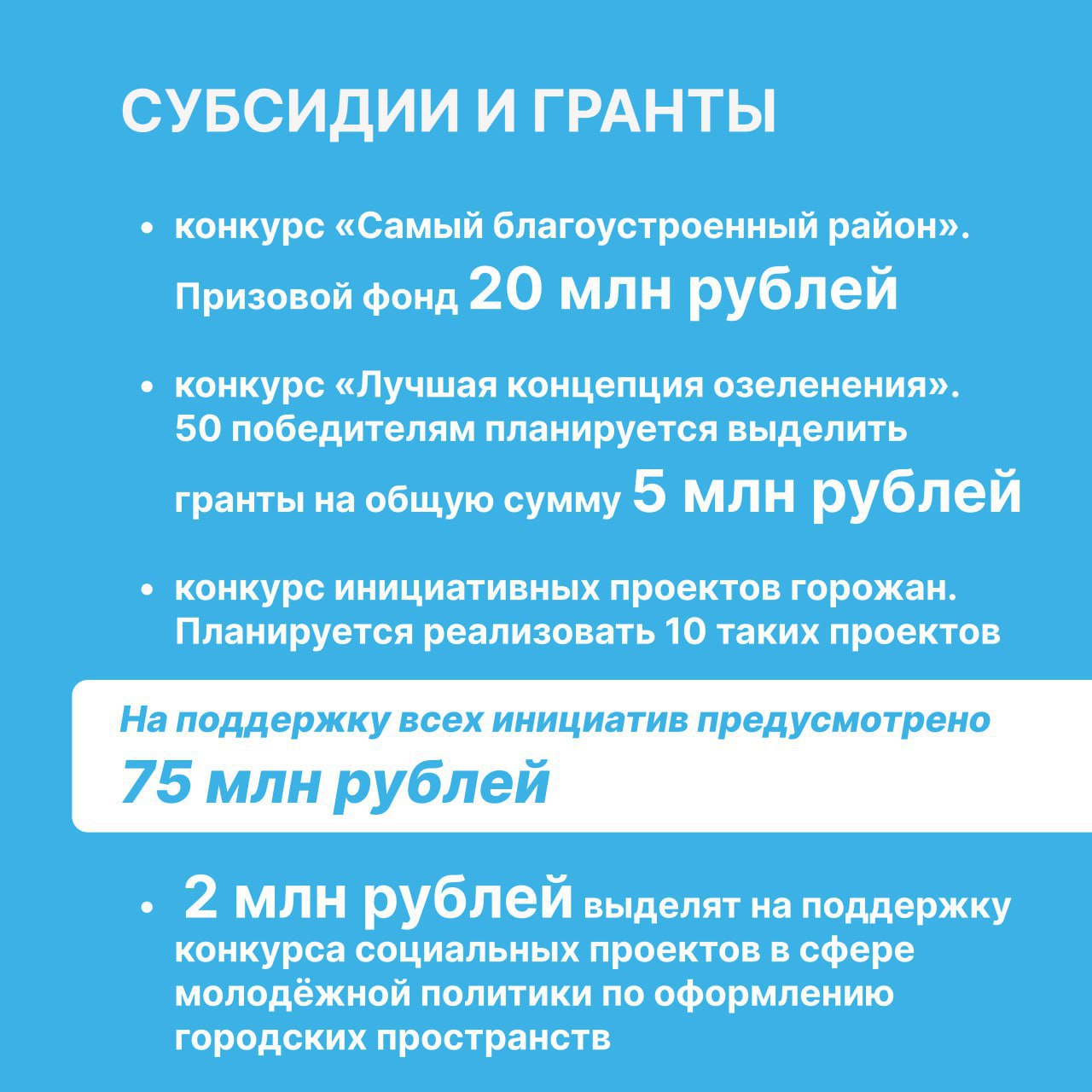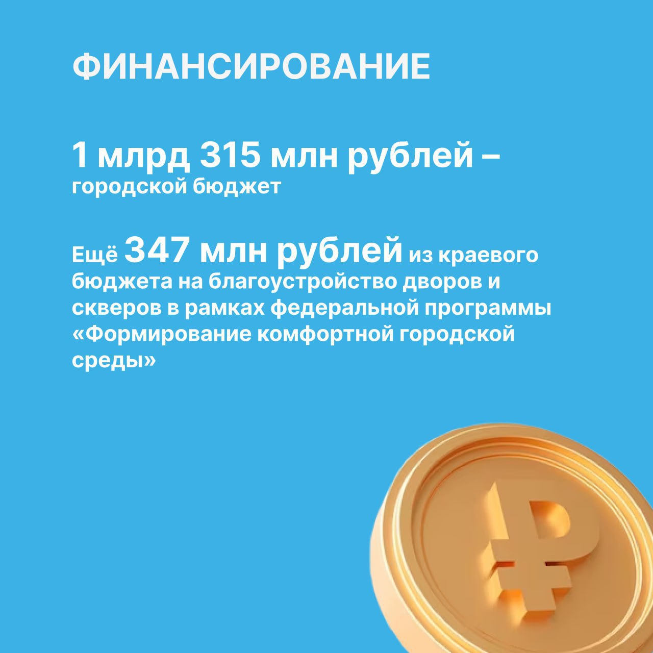 На реализацию программы «Повышение эффективности деятельности городского самоуправления по формированию современной городской среды» будет направлен 1 млрд 315 млн рублей. К ним добавятся дополнительные 347 млн рублей из краевого бюджета на благоустройство скверов и дворов. В мэрии отмечают, что это в 2 раза больше, чем годом ранее.