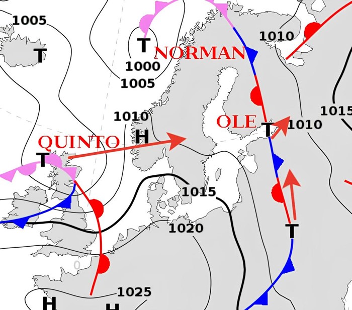 Также Александр Колесов показал две синоптические карты с циклонами и подчеркнул, что перед выходными заканчивается "этот непонятный южный вынос воздушных масс" и "“проползание” атмосферных фронтов посередине Ленинградской области".