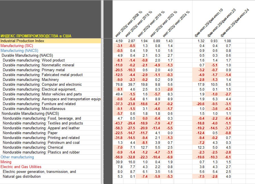 ▪️ Обрабатывающее производство +0.7% г/г за последние 6м и +1.4% г/г в июле, к 2019 +0.4% по 6м сравнению (фев-июл.25 к фев-июл.19).