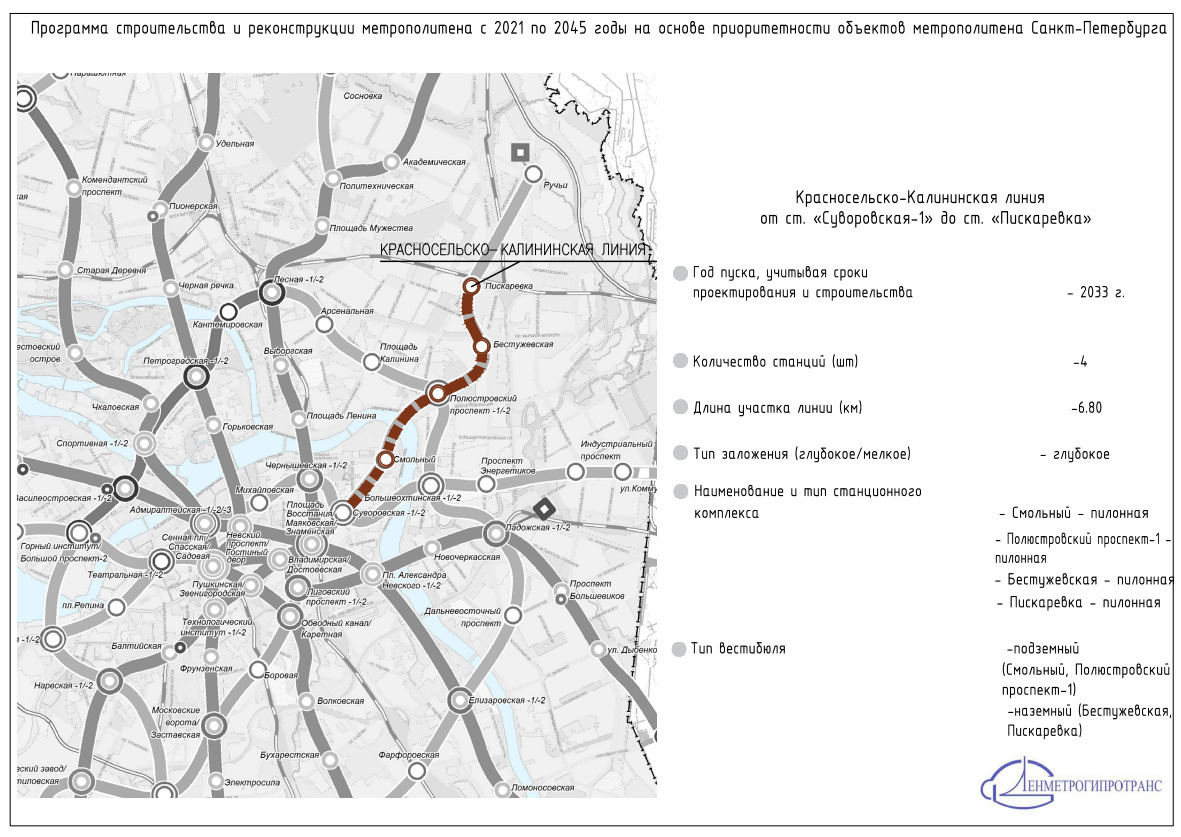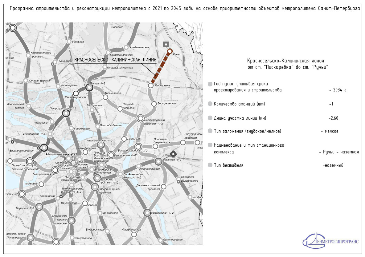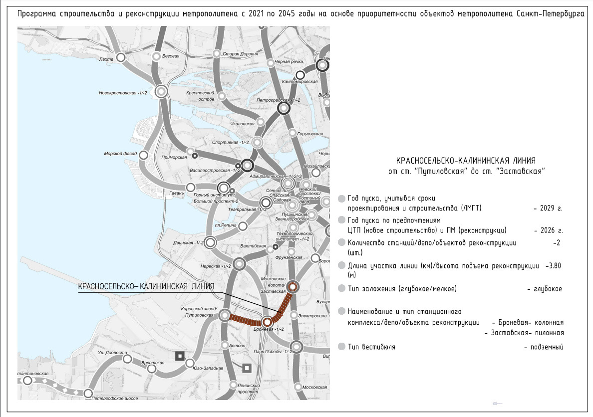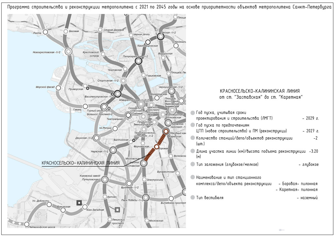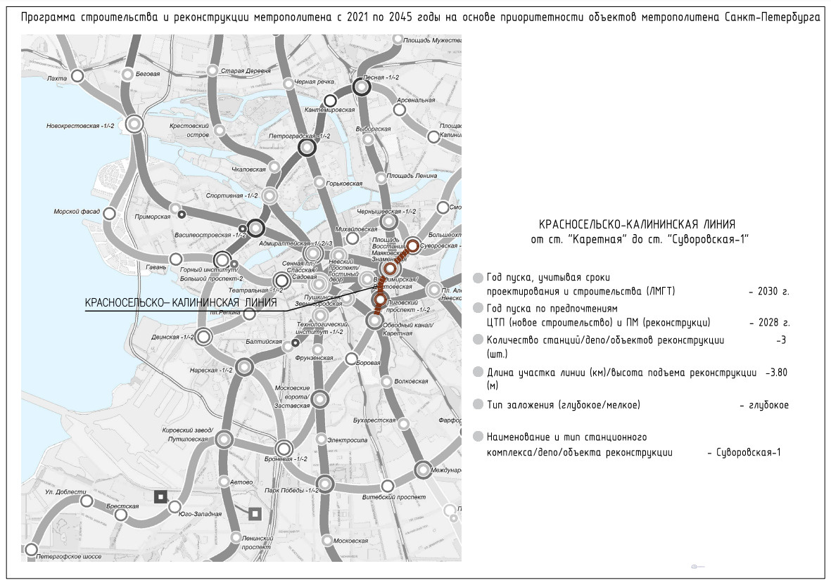 Пару лет назад предполагалась следующая схема: сперва строится первый участок Красносельско-Калининской линии «Казаковская» — «Путиловская». Затем участок «Путиловская» — «Каретная», после продолжение: «Лиговский проспект-2» (пересадочная с «Лиговским проспектом»), «Знаменская» (пересадочная с «Маяковской»), «Суворовская-1». Еще дальше, в 2030-х — станции «Смольный», «Полюстровский проспект», «Бестужевский» и «Пискаревка». Заканчивалось все станцией «Ручьи» и одноименным депо.