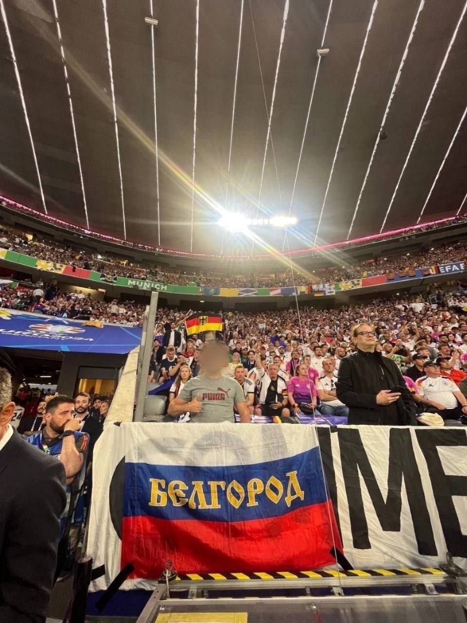 Болельщики из России добрались на матч Германия - Шотландия и растянули флаги в поддержку России и Белгорода, который находится под обстрелами ВСУ. Наши слоны.