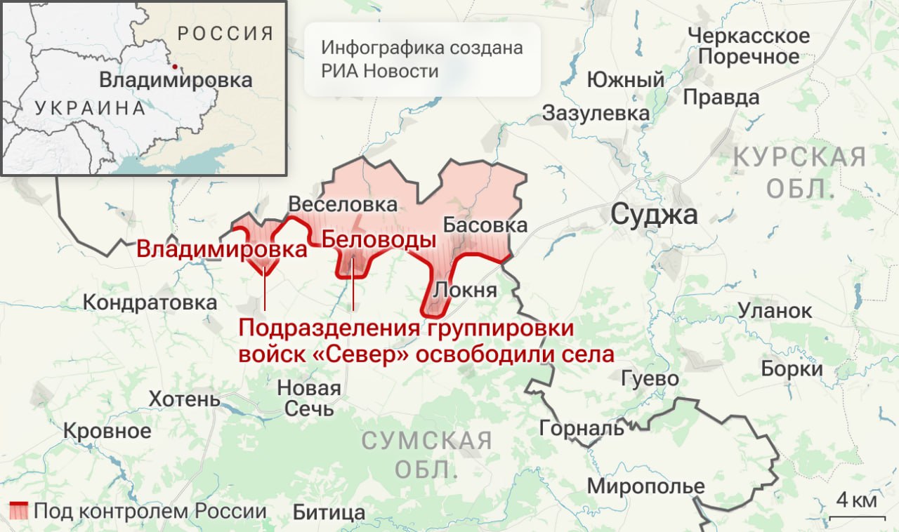▪️Группировка войск "Север" освободила Владимировку и Беловоды в Сумской области, говорится в сводке Минобороны.