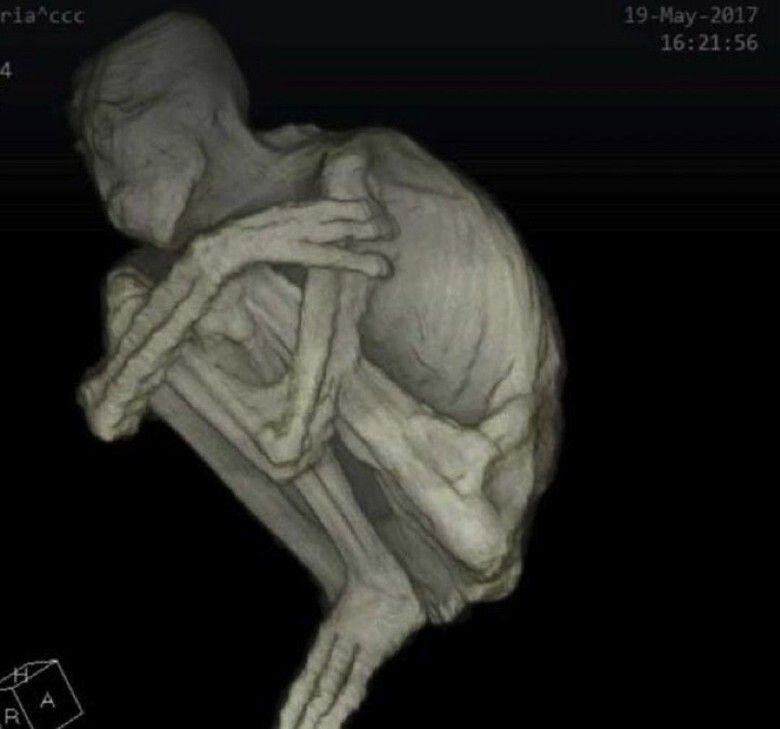 Немного предыстории. В далеком и спокойном 2017 году в одной из пещер, находящихся в Перу, откопали какую-то загадочную фигню. Этакую засушенную версию Волан-де-Морта на минималках. Тушка дохленькая, пальцев на руках три, череп, как и положено, неопознанным, удлиненный.