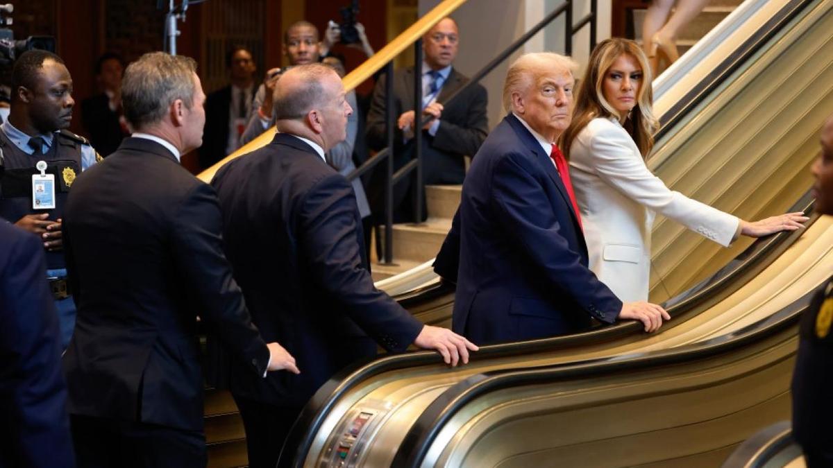 Пресс-секретарь американской администрации Кэролайн Левитт в соцсети X сообщила, что эскалатор остановился, когда на нем находились Дональд Трамп с супругой.