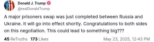 Когда Трамп 23 мая опубликовал пост об обмене пленными, он даже не начался, утверждает Politico. МО РФ сообщило об обмене спустя четыре часа.